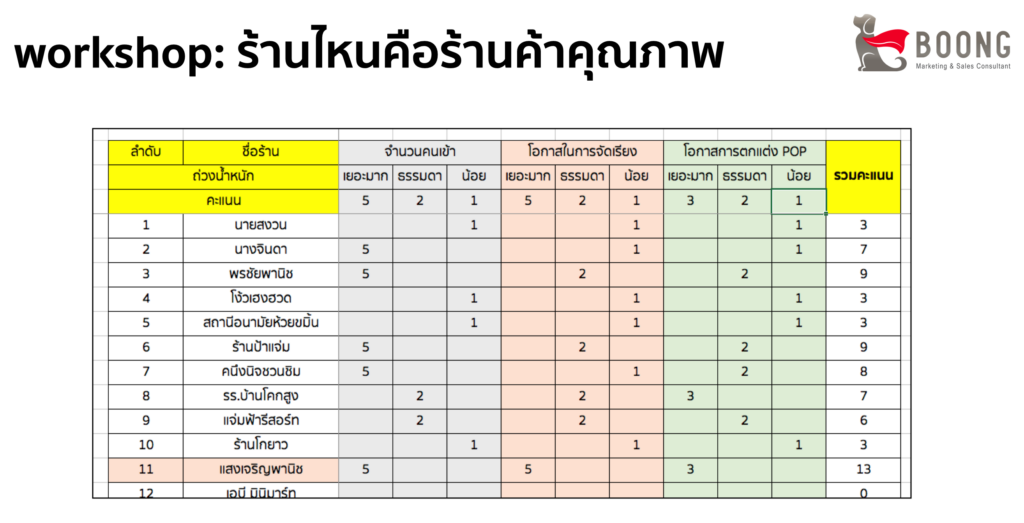 อันนี้เป็นตัวอย่าง workshop ที่ผมออกแบบไว้โดยการใช้ตารางแบบถ่วงน้ำหนัก เพื่อหาค่าในการพิจารณาว่า ร้าน Sub Dealer ไหนเป็นร้านค้าที่มีศักยภาพสูงครับ