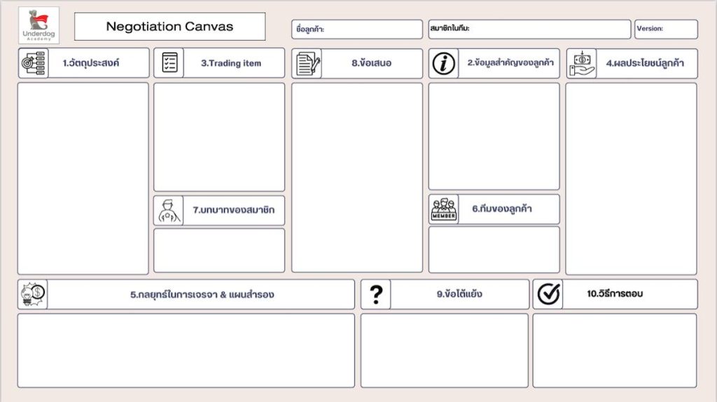 ก่อนหน้านี้ผมเคยออกแบบที่เรียกว่า Negotiation Sales Kit ก็มีทั้งหมดหลายหน้าอยู่ แต่ในยุคปัจจุบันที่ทุกอย่างต้องมีความรวดเร็ว สามารถสรุปสิ่งสำคัญๆให้หมดภายใน 1 หน้า เลยออกแบบใหม่ชื่อว่า “Negotiation Canvas”
